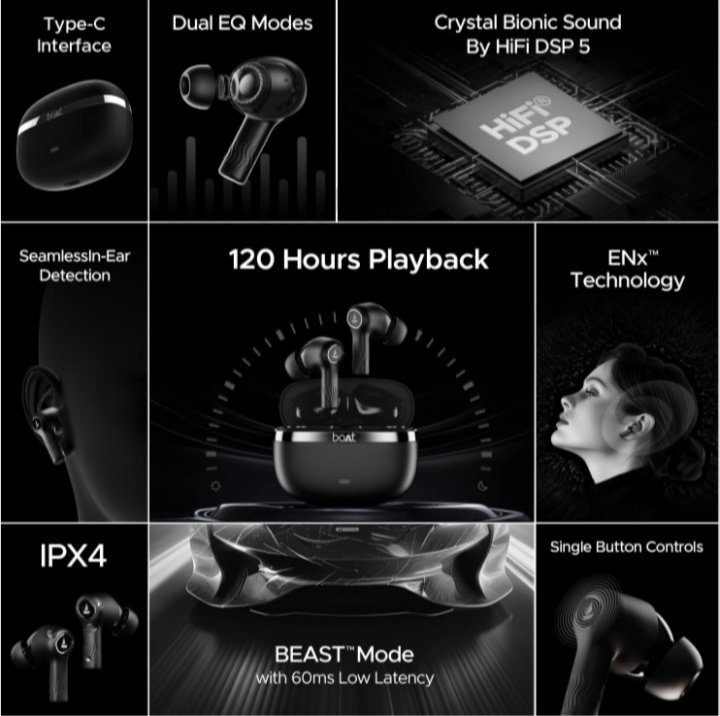 Boat Nirvana Ion, 120HRS Battery, Crystal Bionic Sound w/Dual EQ Modes, 4Mics ENx, App Support, Low Latency, IPX4, v.5.2 Bluetooth Earbuds, TWS Ear Buds Wireless Earphones with mic (Charcoal Black)
