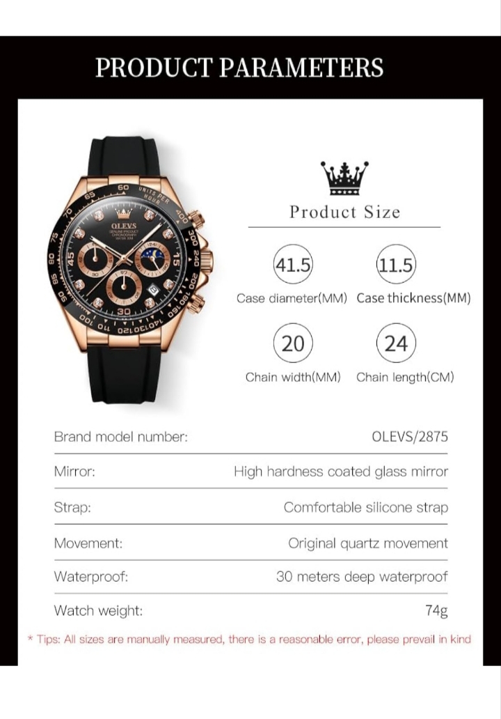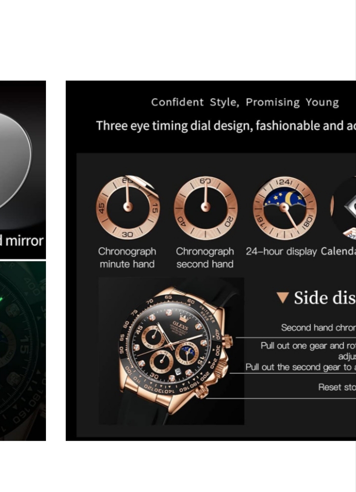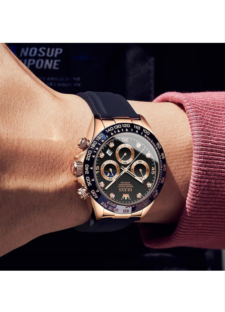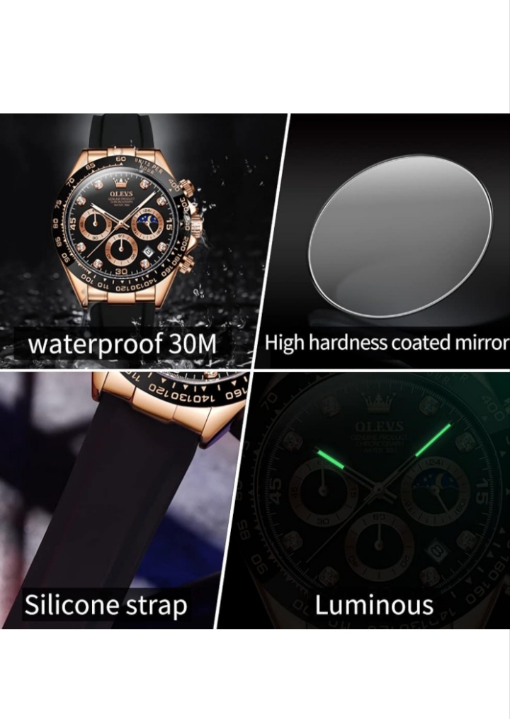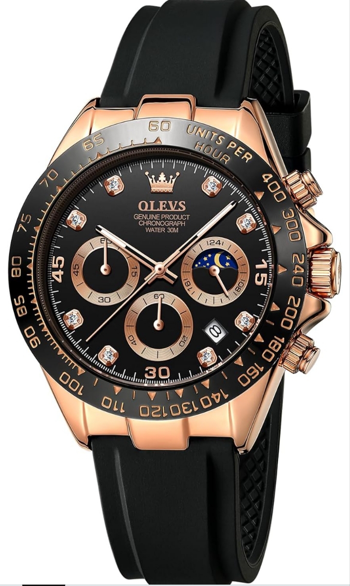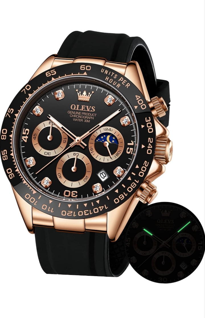 OLEVS Watches for Men Analog Quartz Chronograph Watch Moon Phase Waterproof Black Silicone Diamond Dress Luminous Easy Reader Wrist Watches